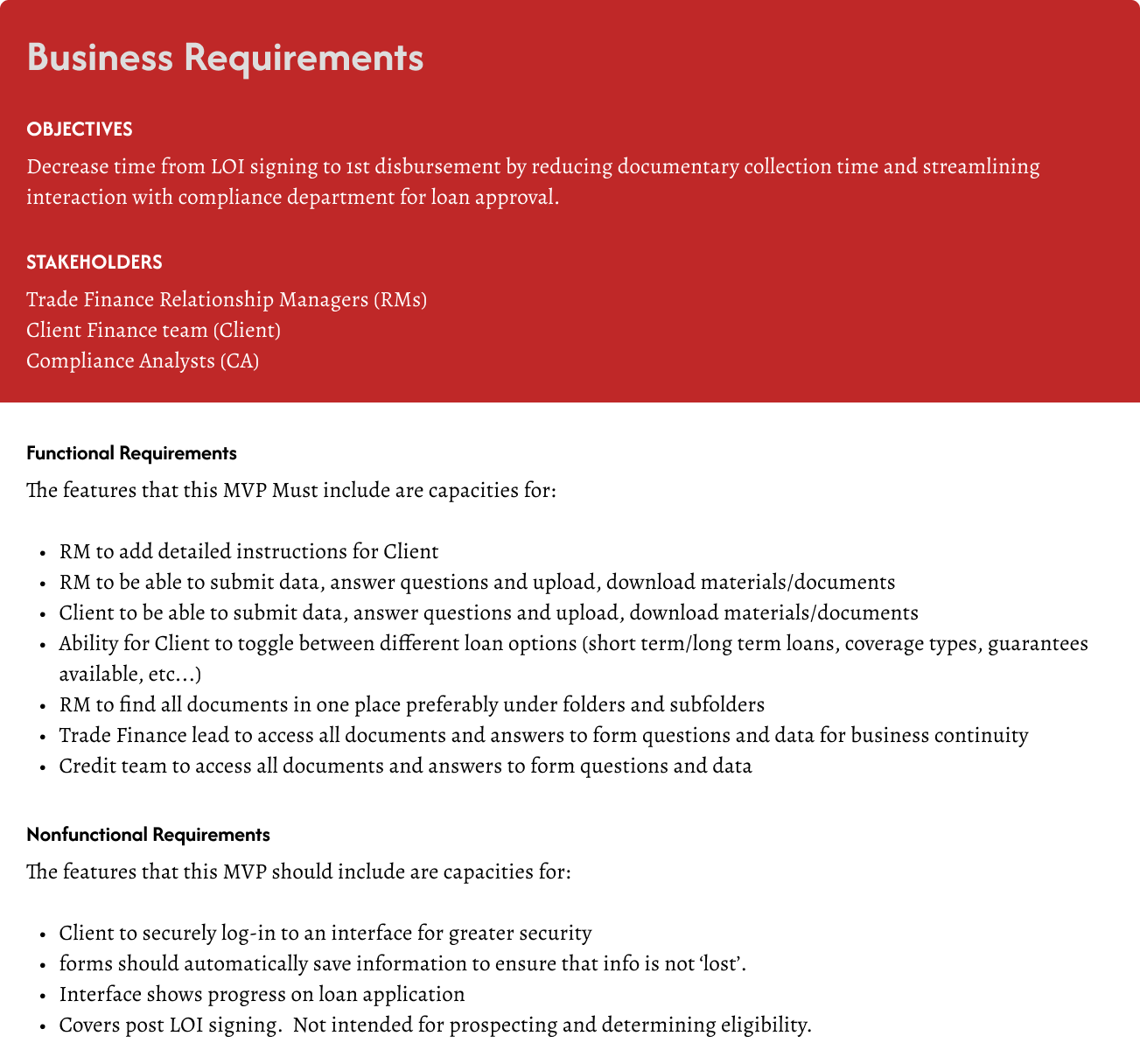 I knew that I would build my MVP in an off-the-shelf tool. However, I was excited to build a web-based application form, so I mocked it up. These mock-up pages also formed a basis in case the bank wanted to throw some budget behind them. Note: It’s in Spanish since over 90% of our clients were from Spanish speaking countries in LATAM region, and in Mexican legal terms, since Mexico was about 60% of our clients and 77% of our outstanding loans.: